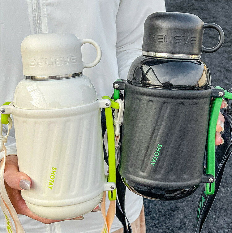 コップ付き 1000ml ステンレスボトル ショルダーストラップ カバー付き コップ飲み 水筒 保温・・・