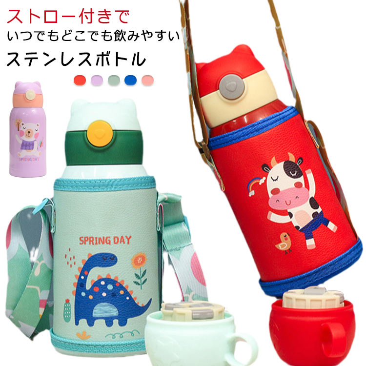 水筒 魔法瓶 ステンレス 真空断熱 ストロー飲み キッズ 女の子 男の子 500ml 子供 ステンレスボトル 保温 保冷 ボトル 子供用水筒 ステンレス製 ショルダーベルト付き ポーチ付き 子