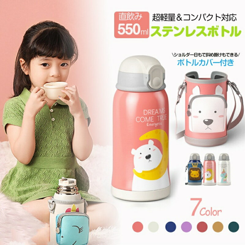 水筒 キッズ 450ml 小学生 子供 直飲み カバー付き 肩紐 保冷 送料無料 ステンレス ボトル・・・