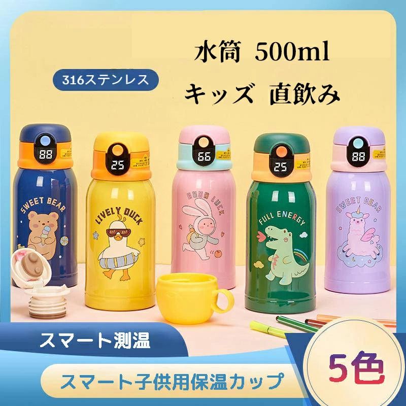 ステンレスボトル 直飲み 水筒 保冷 持ち運び 魔法瓶 かわいい おすすめ オススメ ギフト 子供用 幼稚園 保冷水筒 斜めかけ可能 ストロー付き 温度表示 可愛い 500ml