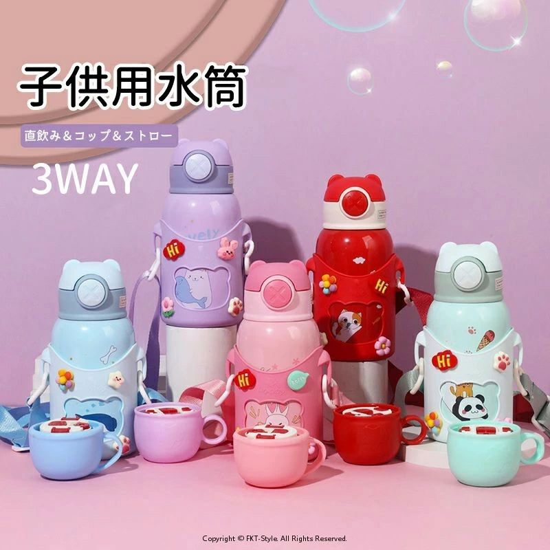保温 子供用水筒 遠足 500ml 水筒 ステンレスボトル 保冷 肩掛け 子供用水筒 3way ワンタッチ 真空断熱 カバー付き ストロー付き 600ml スポーツ 誕生日 子供