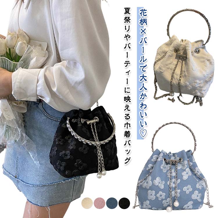巾着バッグ レディース ショルダー 斜め掛け パール付き チェーンバッグ ワンハンドル 浴衣バッグ 夏バッグ 和風 バッグ 手提げ レトロ おしゃれ お呼ばれ 黒 白