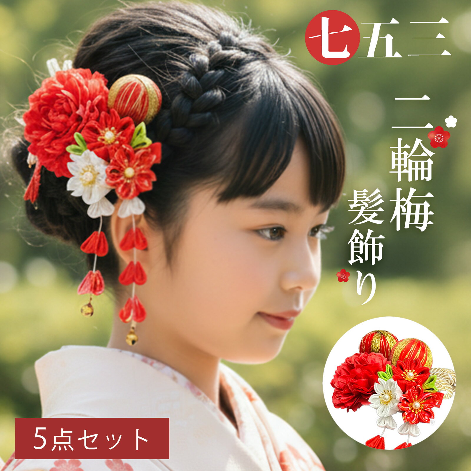 送料無料 七五三 5点セット 髪飾り 浴衣 夏祭り子供 赤 白 パール キッズ髪飾り 女の子 和装 ・・・