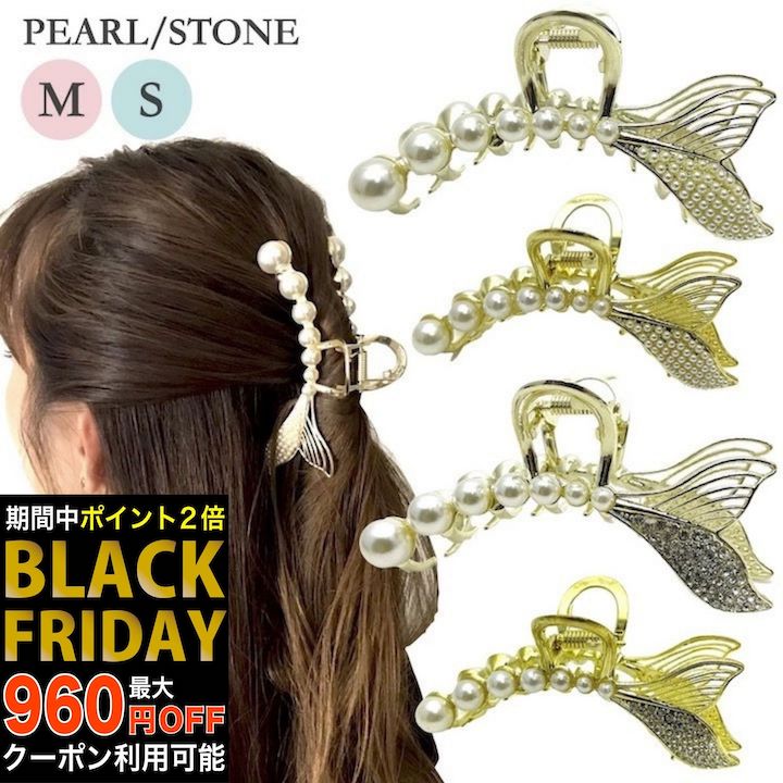 【ブラックフライデーSALE】【バンスクリップ】2サイズ パール ストーン 合金 ゴールド 金魚 人・・・