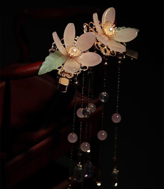 ヘアアクセサリー クリップ ヘアピン 白 ピンク 蝶 花 ビーズ チャーム 房 ロング 髪飾り 髪留・・・