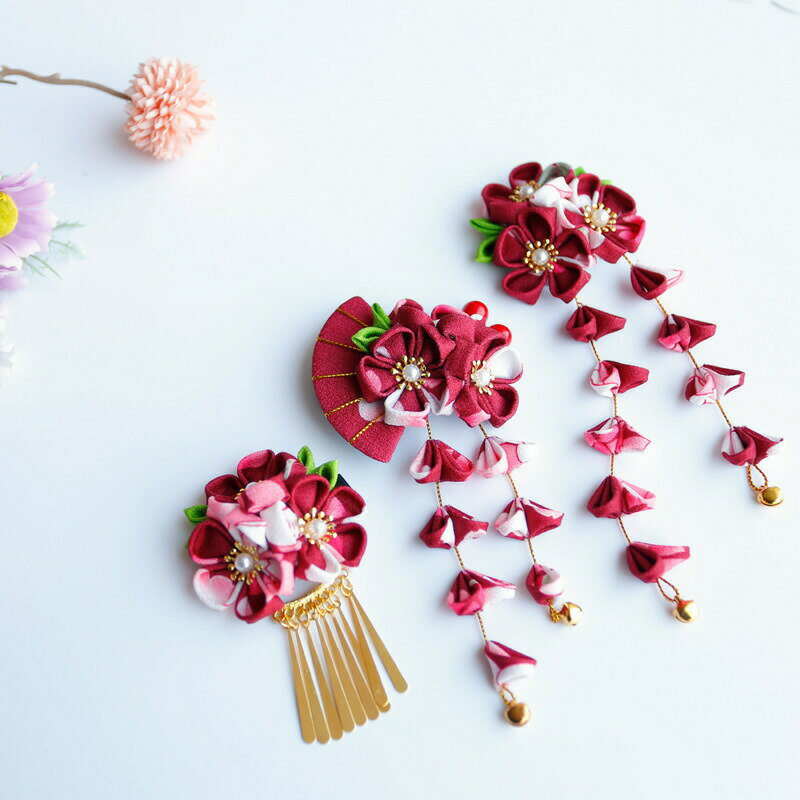 髪飾り 2点セット 花 桜 扇型 浴衣 着物用 つまみ細工 フリンジ 鈴付き 和装アクセサリー ヘア・・・