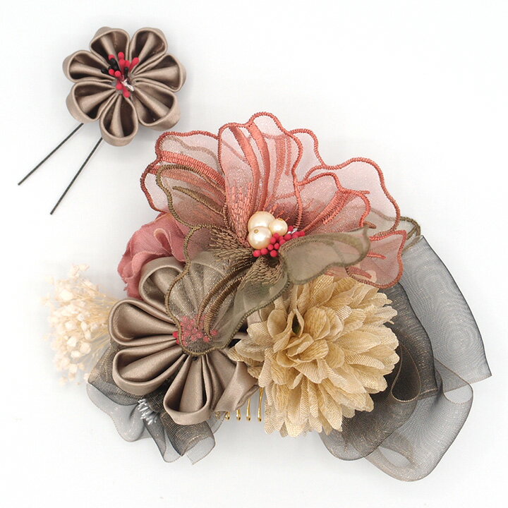 大人の品のあるくすみカラー髪飾り。一味違うオシャレを楽しんでみませんか^^コームとUピンの2点セットなので誰でも簡単に使用できちゃいますよ。成人式、卒業式、夏祭りなどに。
