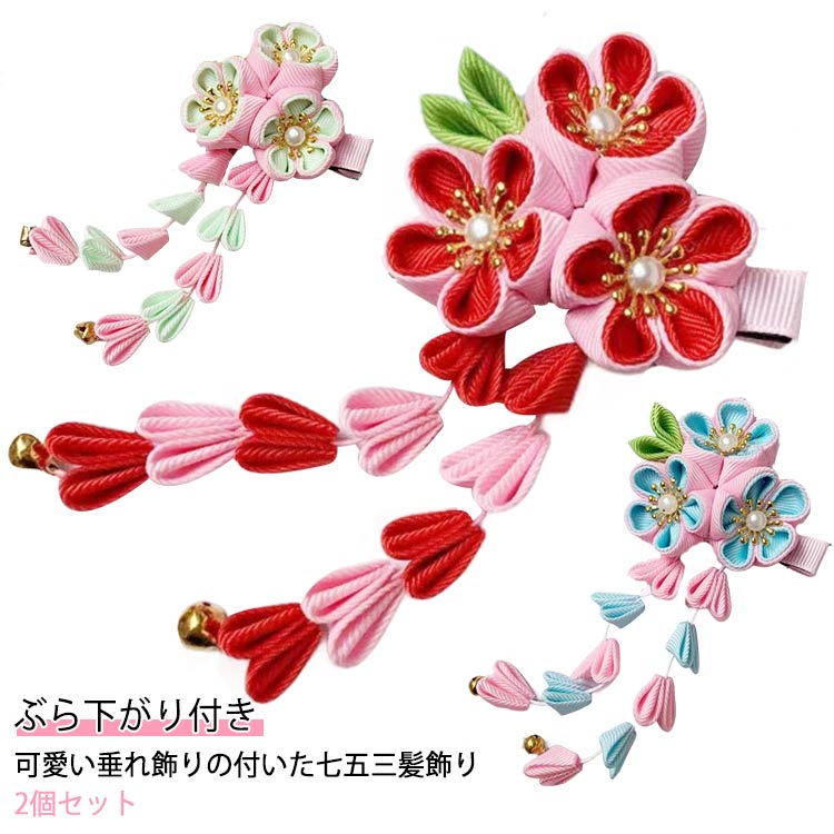 七五三 髪飾り 三歳 七歳 2個 セット パッチン留め かんざし 簪 つまみ細工 ちりめん 縮緬 び・・・