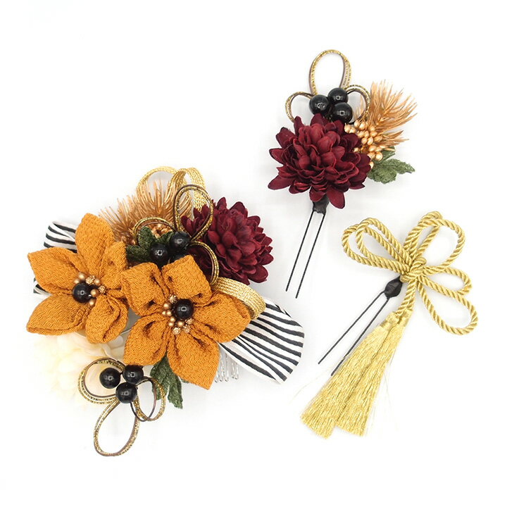 髪飾り 3点セット 黄色 つまみ細工 リボン 成人式 花 和風 浴衣 着物 振袖 袴 ドレス 七五三・・・