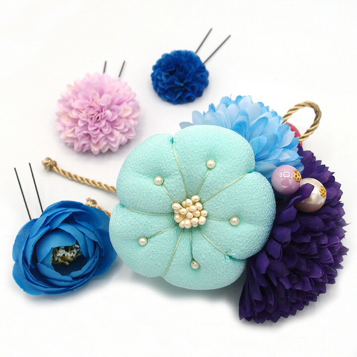 思わず可愛いと言いたくなるぷっくりした縮緬地の梅やダリアとピンポンマムにパールビーズや組紐まで添えられた髪飾りでなんと豪華4本セットです。成人式、卒業式、夏祭りなどにオススメ