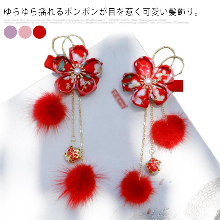 2点セット 七五三 髪飾り 夏祭り 浴衣 着物 ヘアアクセリー ヘアクリップ フラワー 和柄 ポンポ・・・