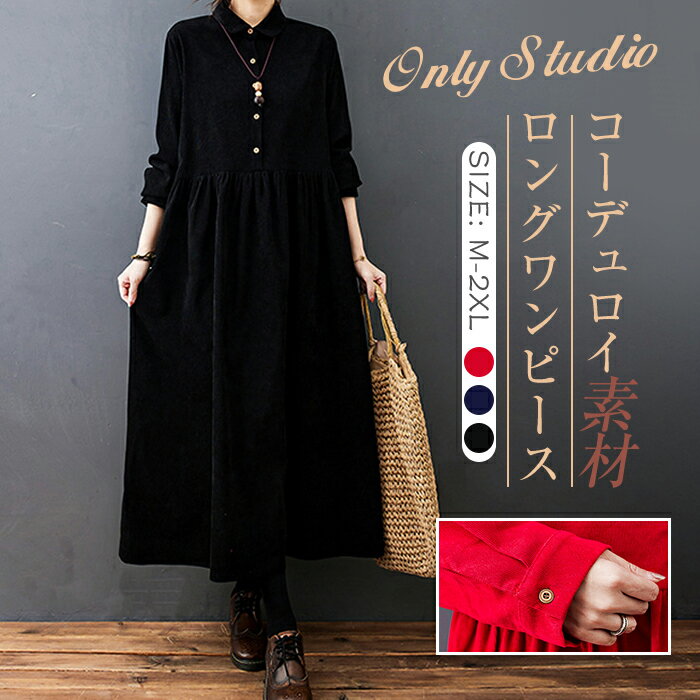 ★送料無料★ワンピース シャツワンピース ロングワンピ レディース ロング丈 マキシ丈 ゆるっとワンピース 長袖 無地 ゆったり コーデュロイ 体型カバー シンプル 秋 冬