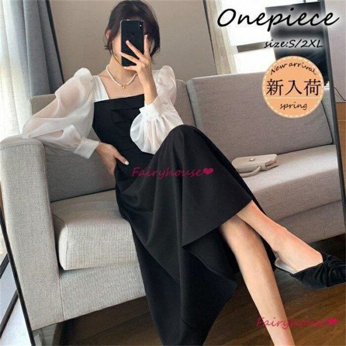 ワンピース レディース 40代 きれいめ マキシ丈ワンピース 春秋 長袖ワンピース 黒 切り替え配色・・・