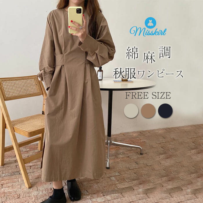 【送料無料◎メール便発送】ワンピース ワンピ レディース Aライン 長袖 ロング フレア ベルト付き 秋服 ワンピース 着痩せ おしゃれ 通勤 OL 綿麻調 スリット フォーマル 無地 可愛い