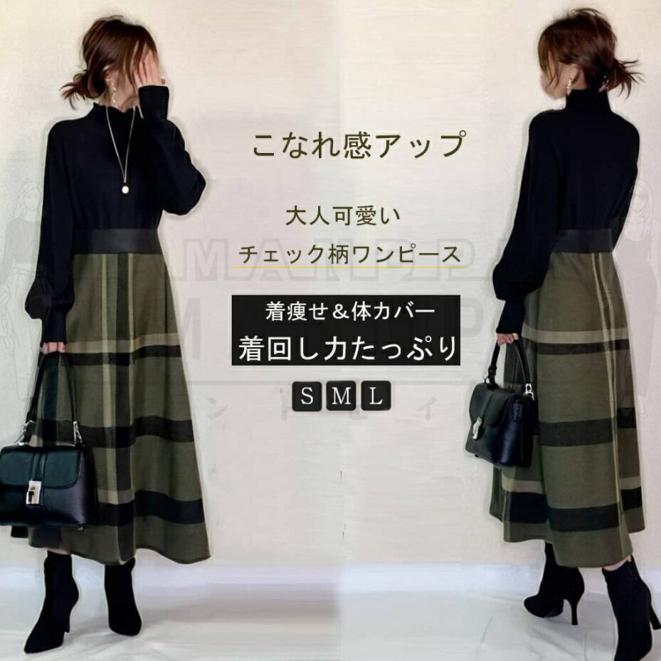 ワンピース ニット レディース きれいめ カジュアル 秋 冬 秋冬 ロング ニットワンピース 長袖 切り替え チエック柄 大きいサイズ