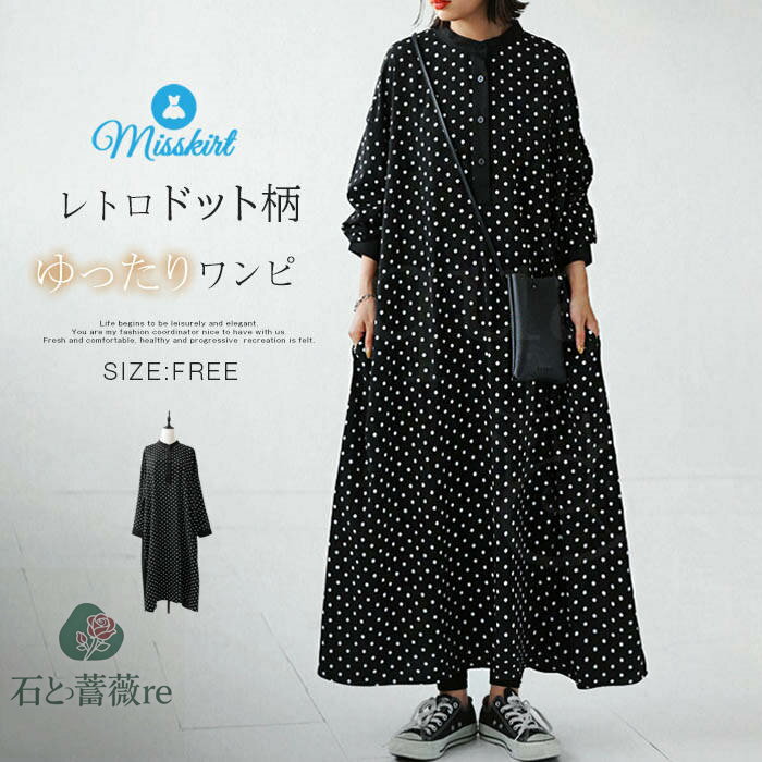 ワンピース レディース 新作 ドット柄 水玉 長袖 ロングワンピース 立ち襟 プルオーバー ボタン ・・・