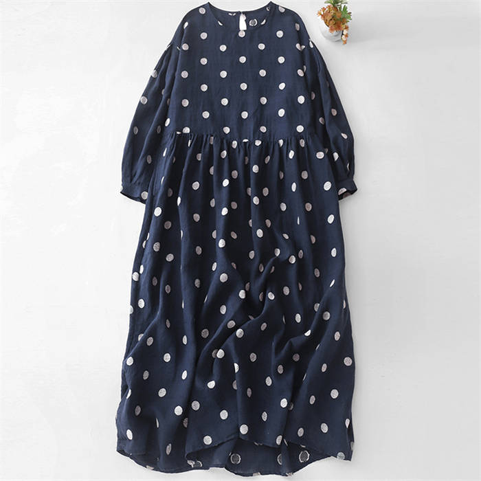 ワンピース レディース 新作 ドット柄 水玉 長袖 綿麻 プリント ラウンドネック ロング ワンピ ・・・