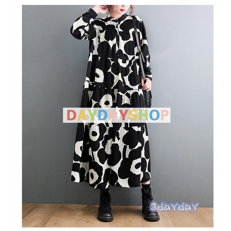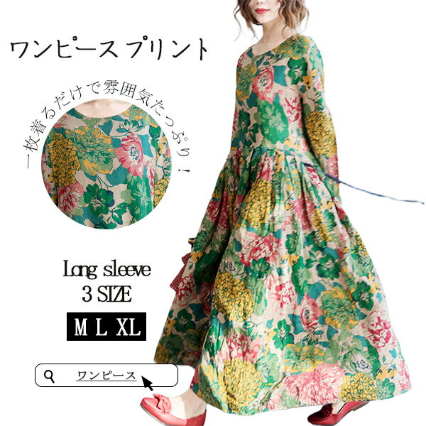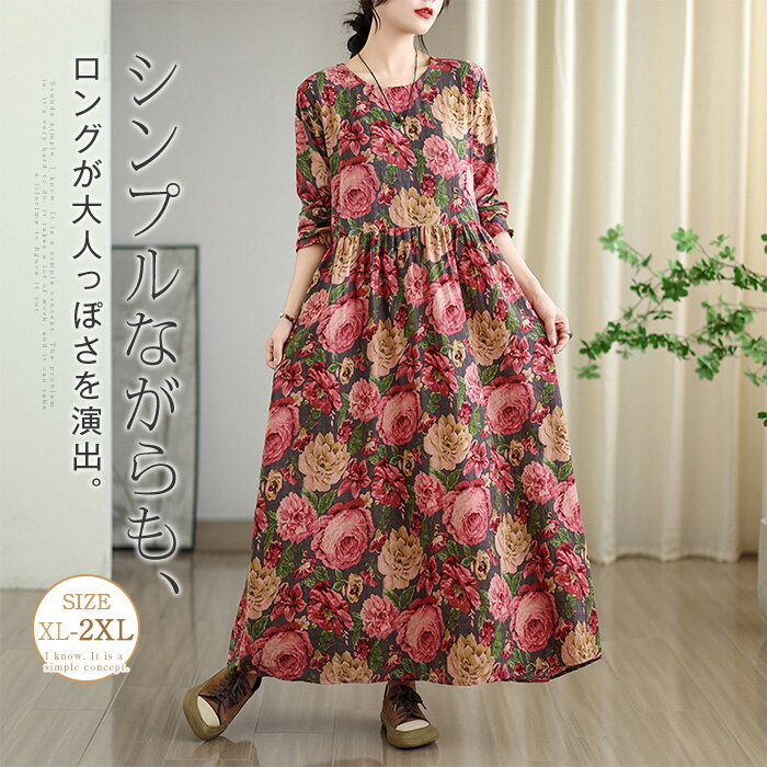 ワンピース ロング 長袖 レディース ロング ワンピース 花柄 マキシ丈 カジュアル プルオーバー 春 秋 新作 体型カバー ゆったり 可愛い 着痩せ クルーネック 大きいサイズ カジュアル