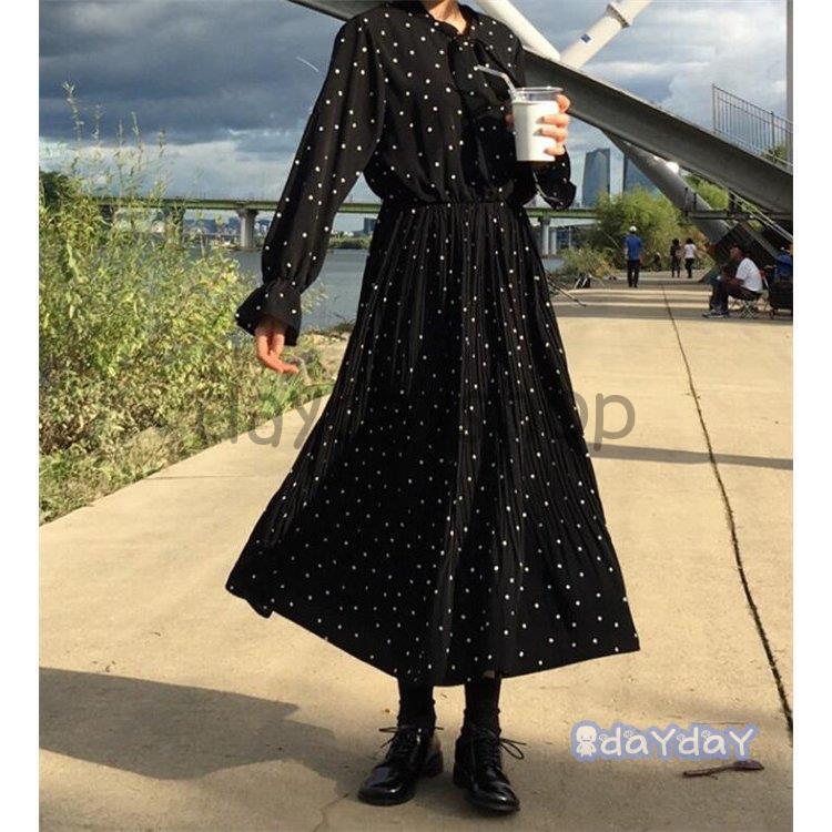 ワンピース きれいめ 長袖 シフォン ロング丈 ドット柄 おしゃれ 着痩せ 体型カバー ひざ丈 レデ・・・