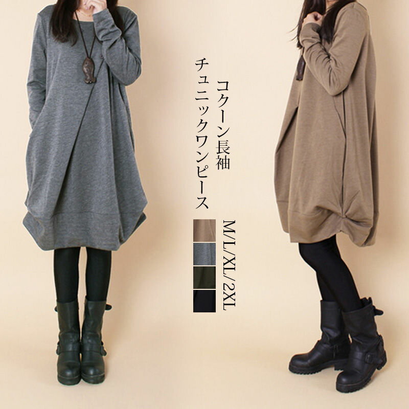 コクーンワンピース コクーン チュニック レディース チュニックワンピース 長袖ワンピース カジュアルワンピース 春 秋 ワンピース シンプル 大人可愛い きれいめ 大きいサイズ