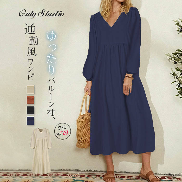 ワンピース ロングワンピース レディース 長袖 無地 バルーン袖 綿麻 綿 コットン Vネック プル・・・