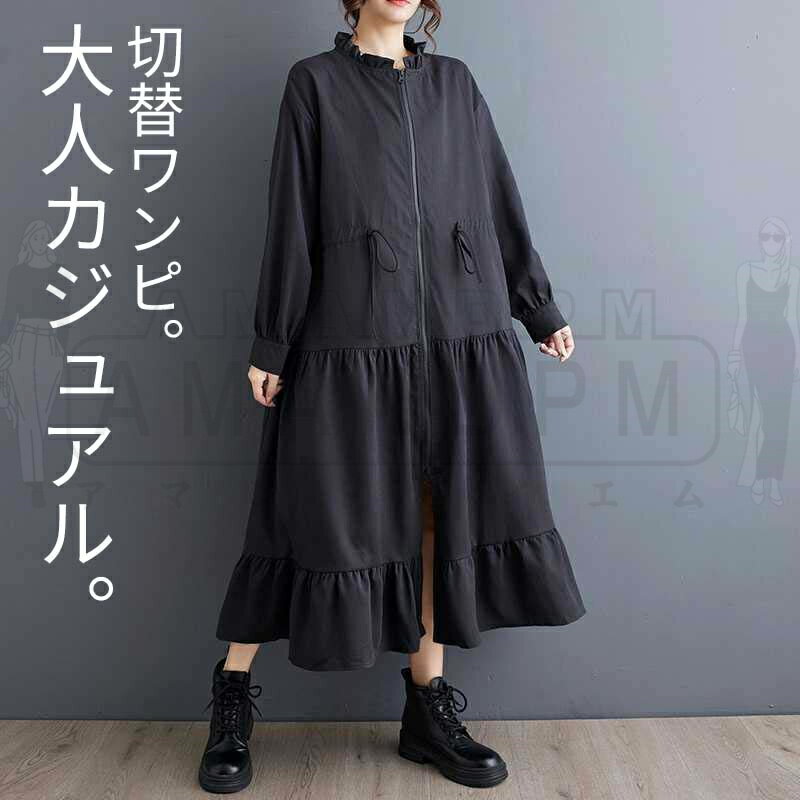ワンピース レディース カジュアル きれいめ 長袖 春 秋 ティアード コート フレア 長袖 ロング aライン 無地 大人 フリルネック