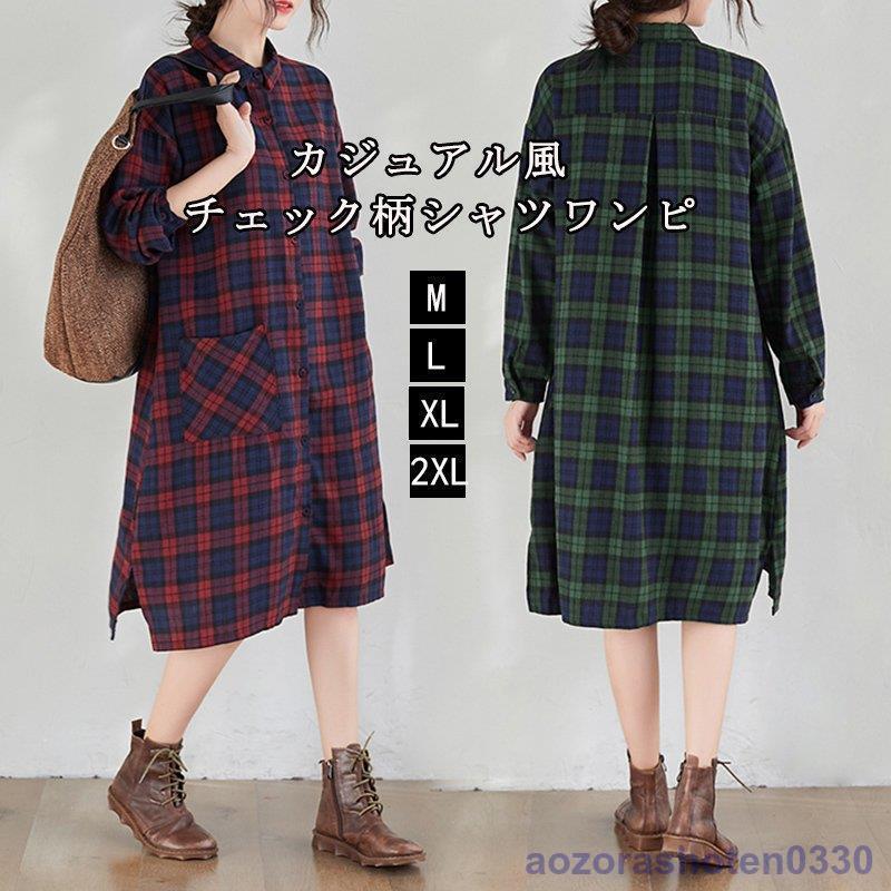 ワンピース チュニック レディース シャツワンピース ロングワンピース ロング丈 長袖 チェック柄 ・・・