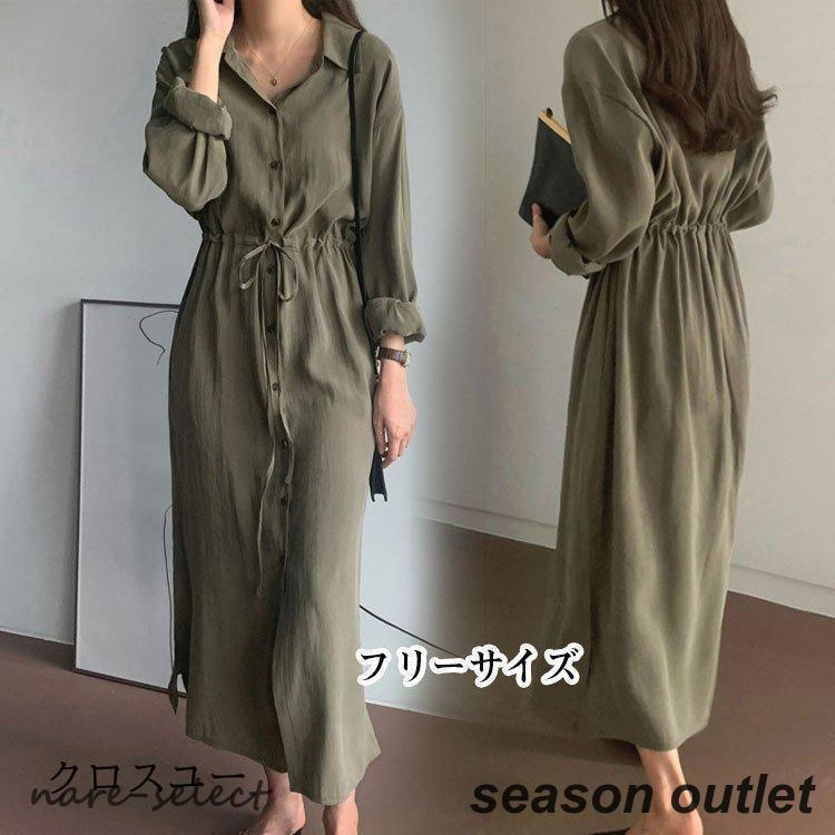 シャツワンピース ワンピース レディース 長袖 春 無地 バンドカラー マキシワンピース フレア A・・・