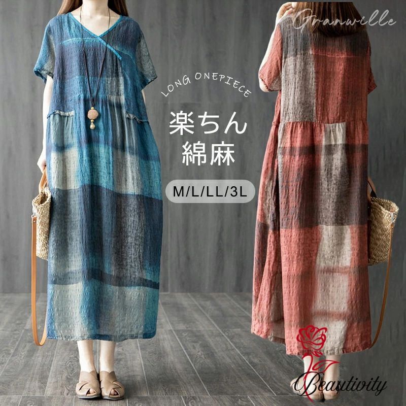 ワンピース 綿麻 レディース 秋 夏 春 半袖 きれいめ 着痩せ カジュアル コットン リネン ワン・・・