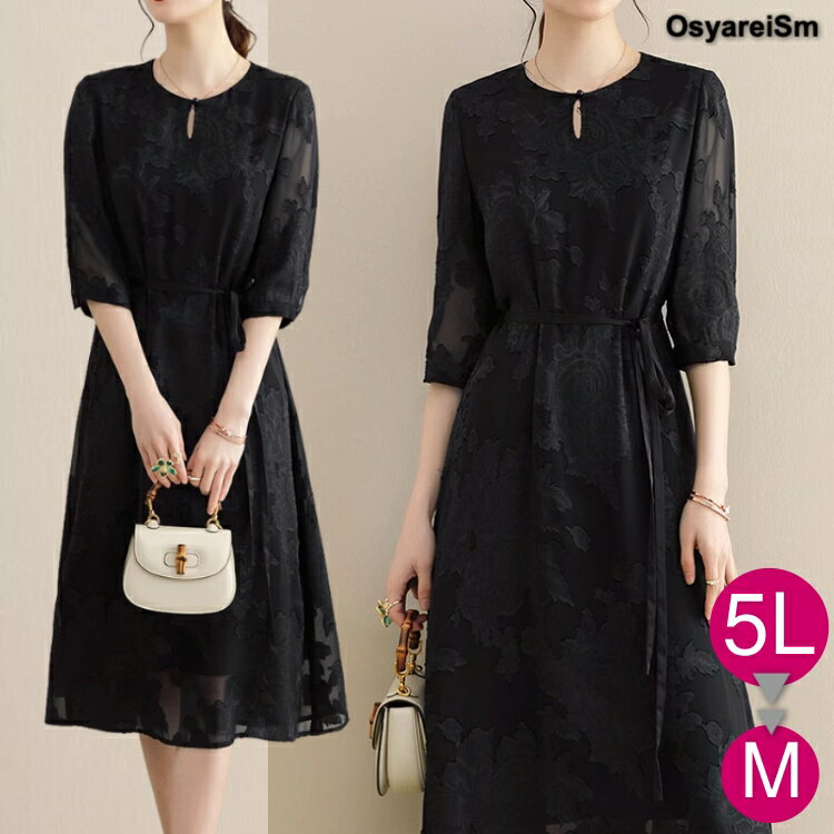 ブラック マザードレス フォーマル ワンピース シニア 膝下 パーティドレス ll 2l 発表会 演奏会 衣装 服 おしゃれ お呼ばれ 二次会 セレモニー 袖付き エレガント