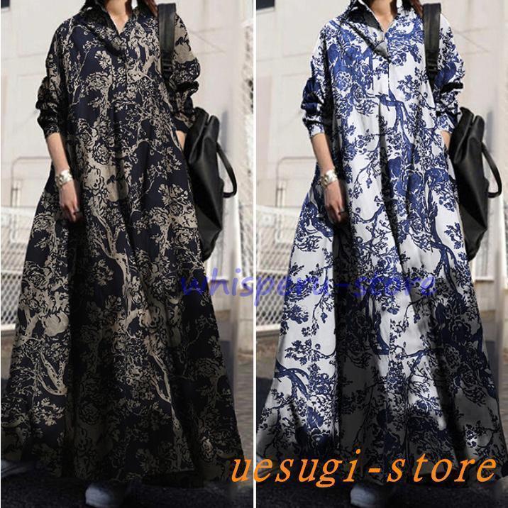 シャツワンピース ワンピース 春 レディース マキシワンピース 秋 長袖 花柄 ロング丈 体型カバー・・・