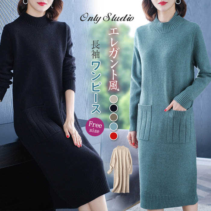 【送料無料◎宅配便発送】ニット ワンピース セーター レディース ニットワンピース ロング ワンピース ゆったり ハーフネック aライン ミモレ丈 厚手 長袖 無地 プルオーバー 通勤 OL