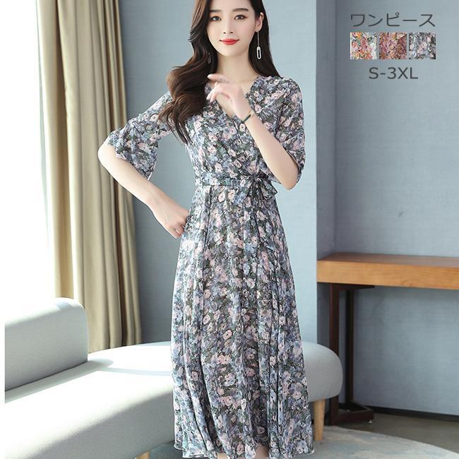 ワンピース レディース 春 夏 春夏 Vネック花柄 ロングワンピース 半袖 マキシワンピース Aライ・・・