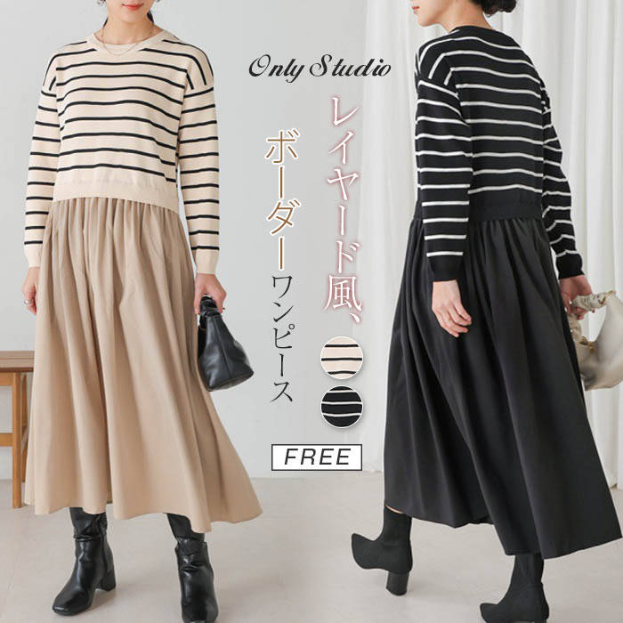 ワンピース レディース 新作 ボーダー柄 フェイクレイヤード 長袖 ロングワンピース ラウンドネック・・・
