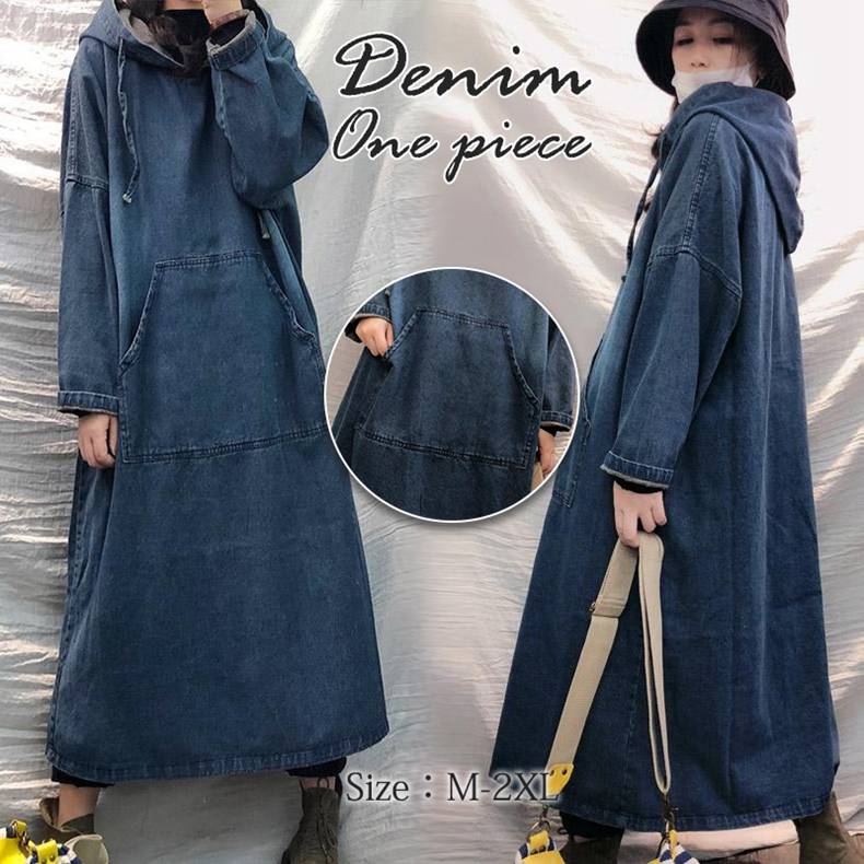 デニムワンピース デニム プルオーバー ワンピース マキシパーカー 大きいサイズ
