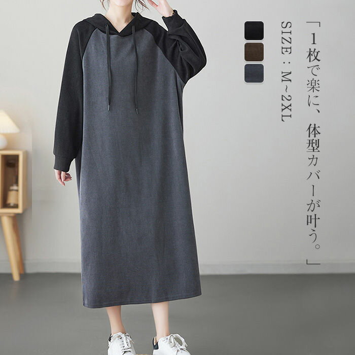 パーカーワンピース レディース ワンピース 秋 冬 長袖 ロングワンピース ロング 切り替え 配色 フード付き リラックス 体型カバー 大きいサイズ ゆったり オーバーサイズ 春 秋冬