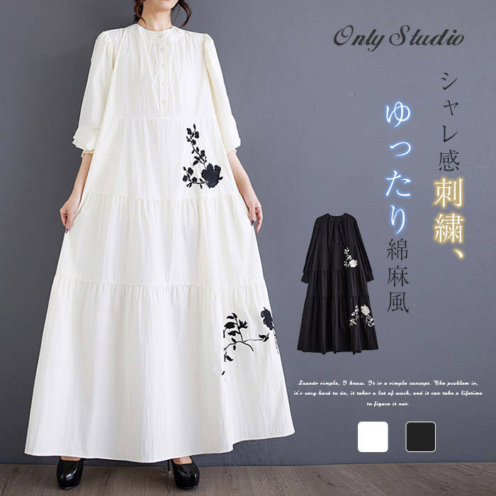 ★メール便送料無料★ワンピース 刺繍 花柄 レディース 新作 バルーン袖 シャツワンピース 立ち襟 長袖 綿麻調 プルオーバー ロング ワンピ 春 秋 デザイン感 カジュアル ゆったり 通勤