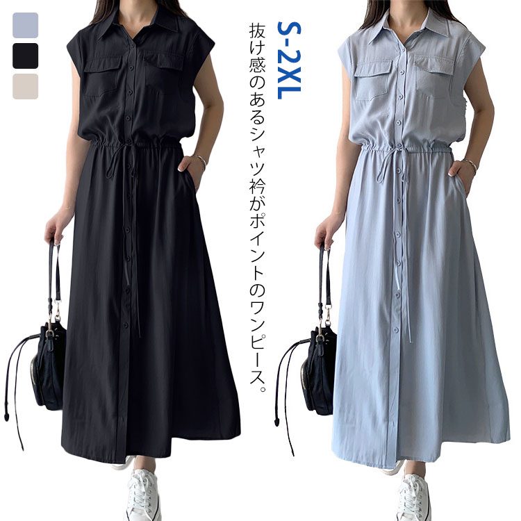 シャツワンピース ロングワンピース ノースリーブ マキシ レディース ロングワンピース ロングシャツ・・・