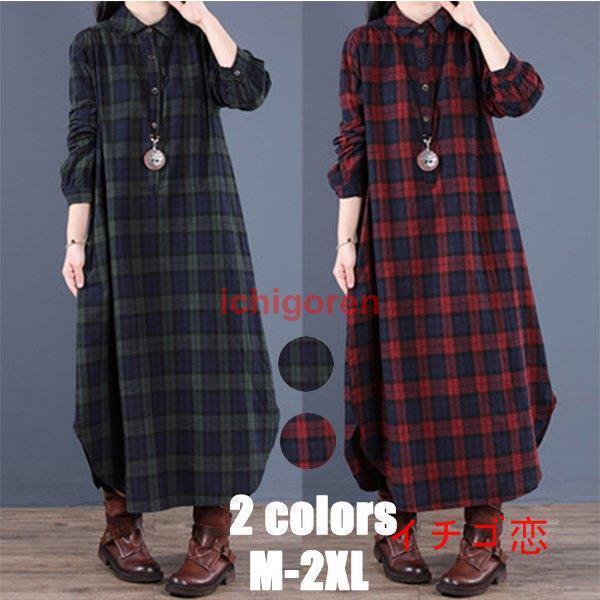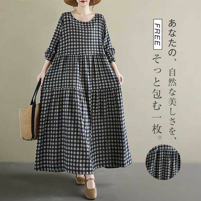 ワンピース ロング 長袖 レディース 綿麻調 ロング ワンピース チェック柄 コットンリネン カジュアル プルオーバー 春 秋 新作 体型カバー ゆったり 可愛い 着痩せ 大きいサイズ