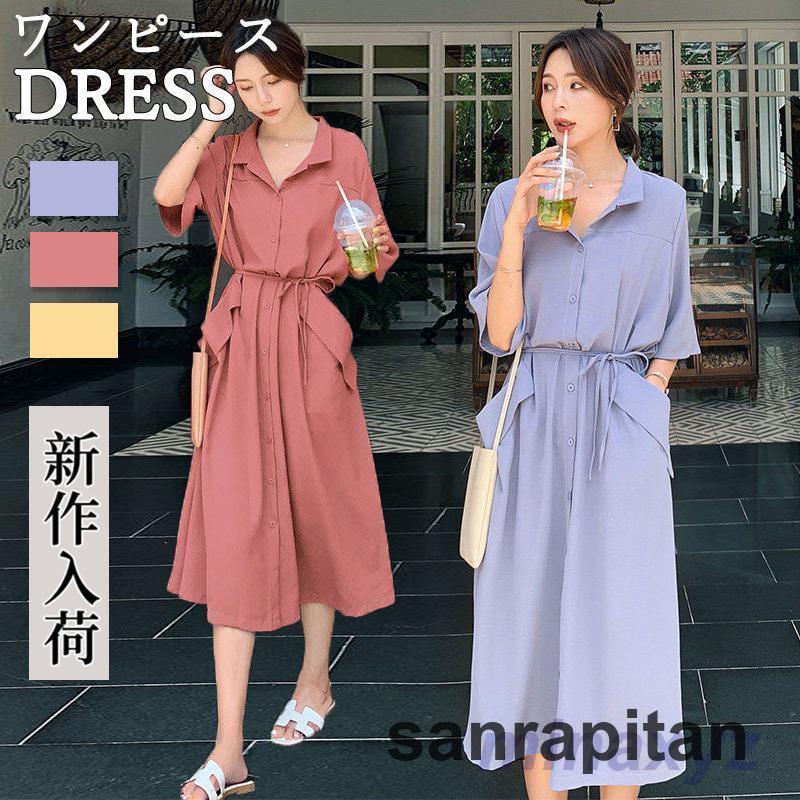 ワンピース 新作 レディース プルオーバー クルーネック 半袖 ロング ワンピ ウエストマーク リボ・・・
