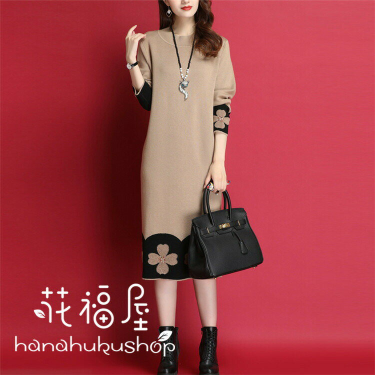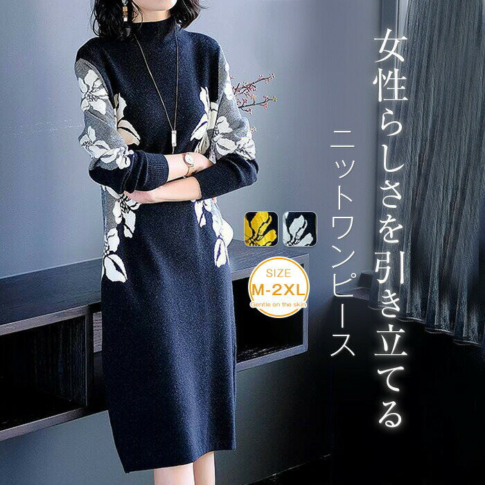ニットワンピース レディース 秋冬 ニット ワンピース 膝丈 ハイネック 花柄 長袖 カットソー ニットセーター カジュアル お出かけ 30代 40代 50代 ママコーデ 着痩せ