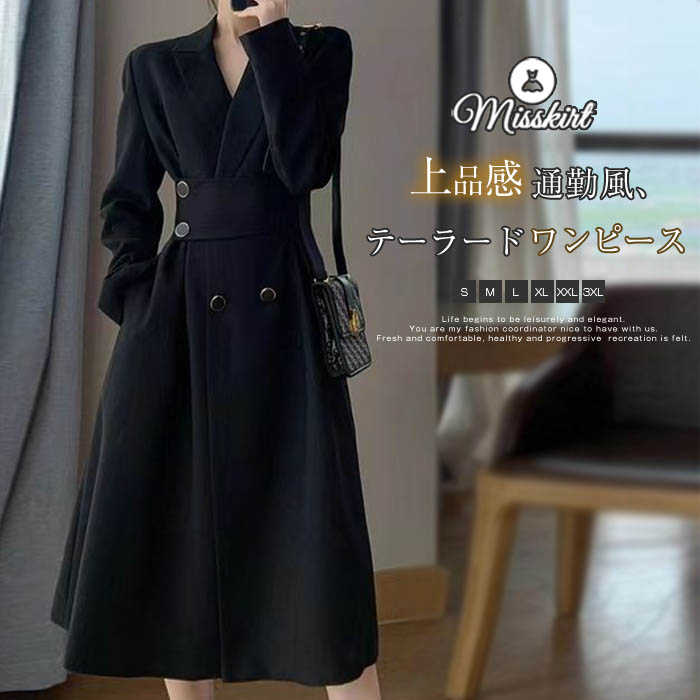 【送料無料◎宅配便発送】ワンピース テーラード ワンピース レディース テーラードジャケット ロングジャケット Vネック ウエストマーク ベルト 長袖 春 秋 冬 無地 切り替え オフィス