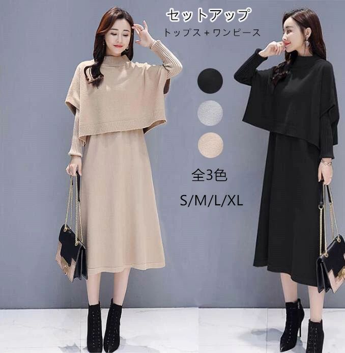 送料無料 セットアップ レディース 秋冬 ワンピース ブラウス 無地 ニットセーター+長袖ワンピース・・・