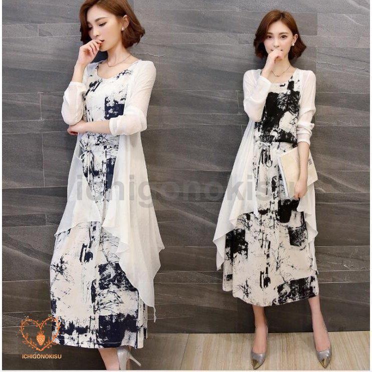 レディース マキシ丈ワンピ お呼ばれ レトロ 日焼け止め長袖トップス+袖なしワンピース エレガント★・・・
