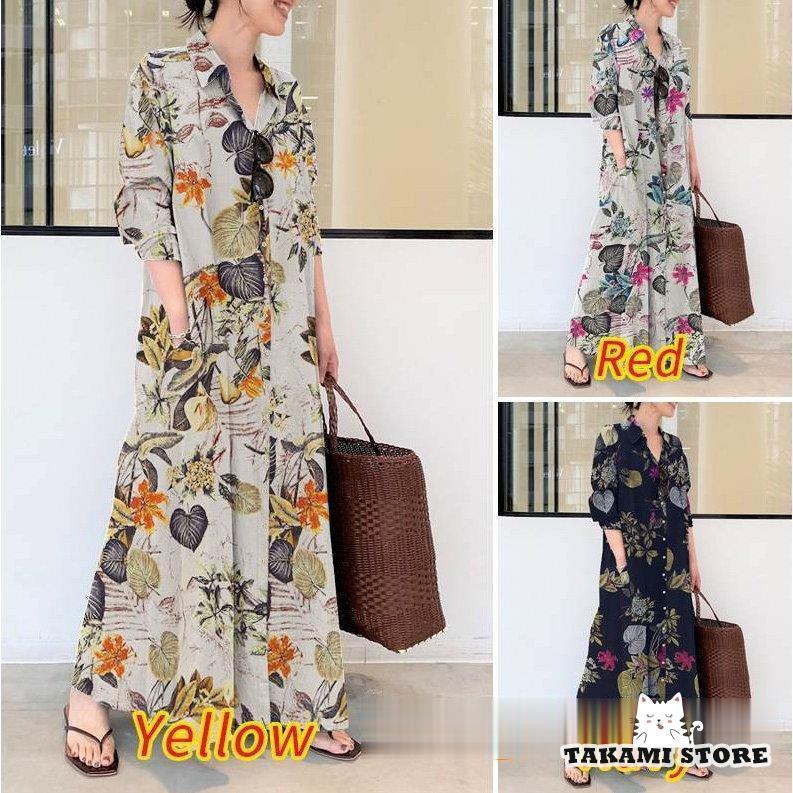 シャツワンピース ワンピース 春 レディース マキシワンピース 秋 長袖 花柄 ロング丈 体型カバー・・・