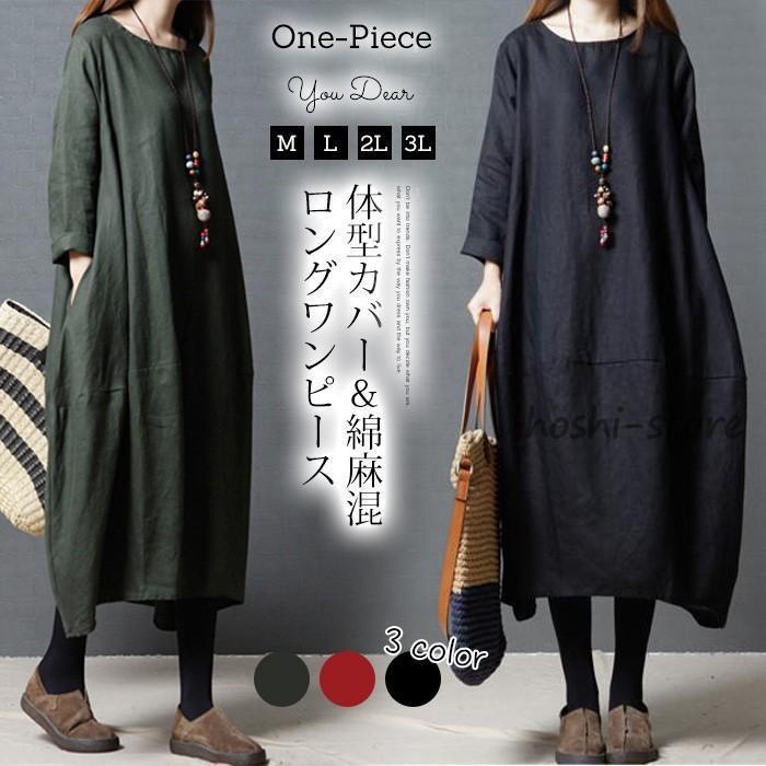 リネン風 レディース ロング丈 ワンピース 秋 ワンピ 長袖 綿麻風 体型カバー 大きいサイズ 赤 黒 緑 着痩せ おしゃれ ゆったり