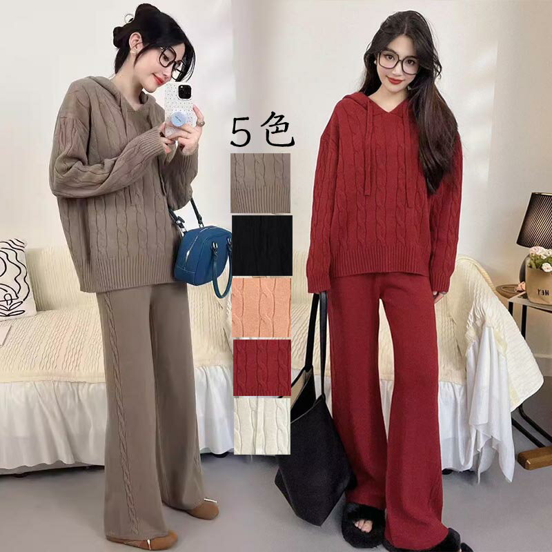 送料無料 2点セット ニットセットアップ セーター プルオーバー フード付き トップス ケーブル編み・・・