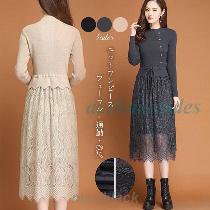 ニットワンピース 長袖 レディース ミモレ丈 着痩せ レーススカート レース裾 通勤 OL ニット ・・・