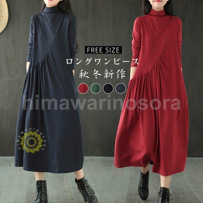 ロングワンピース レディース ワンピース 長袖 秋 冬 ロング丈 体型カバー ハイネック ゆったり ・・・