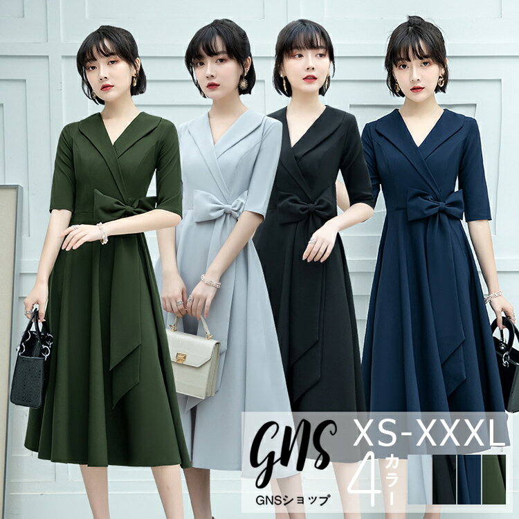 パーティードレス 結婚式 ワンピース ドレス XS SS S M L LL XL 2L 3L 三分袖 謝恩会 発表会 演奏会 同窓会 女子会 20代 40代 50代 母 着痩せ ネイビー 黒